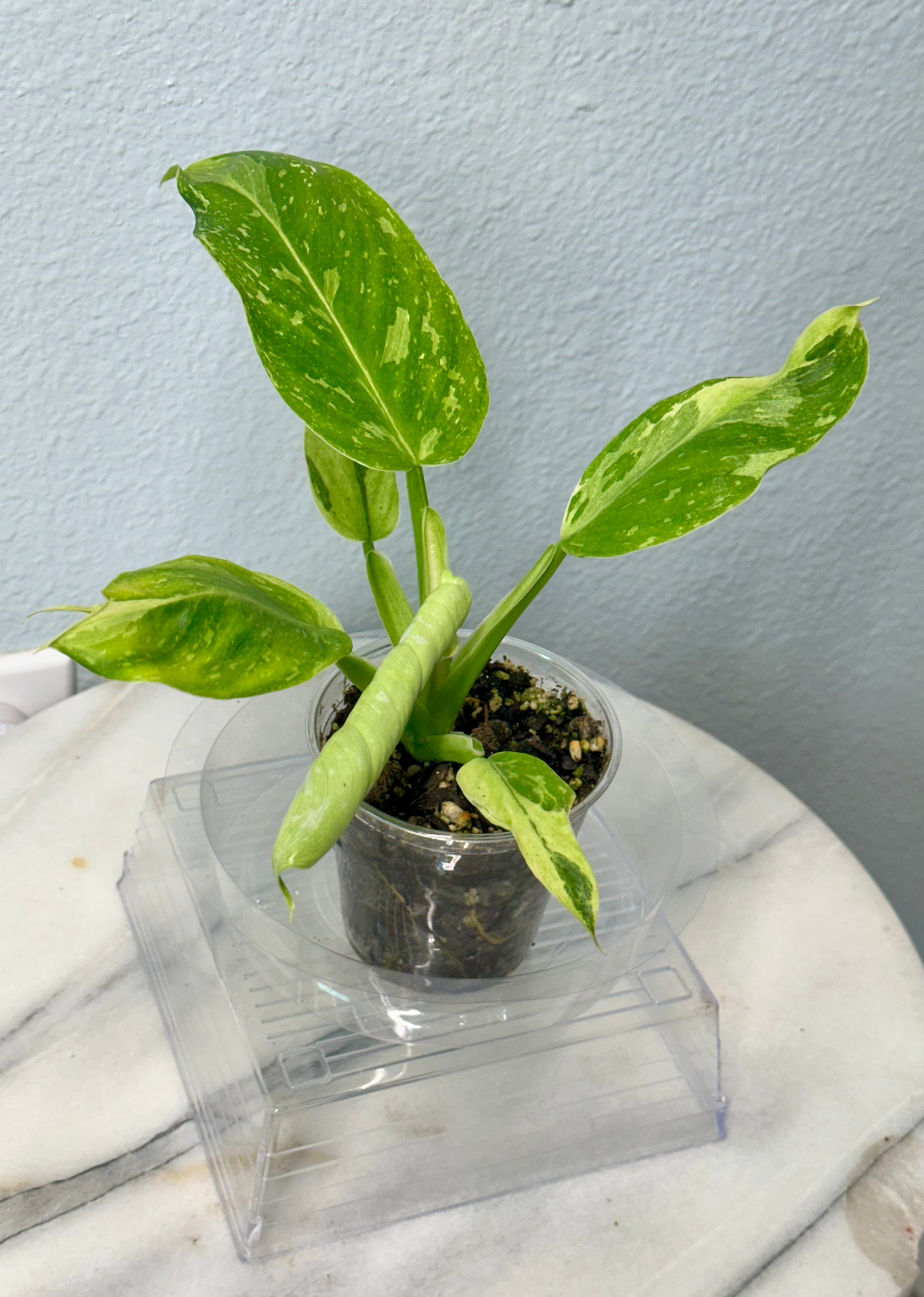 The Jose Buono Philodendron features oversized, paddle‑shaped leaves splashed with creamy white and soft green marbling, creating a bold tropical statement plant that thrives in bright, indirect light.